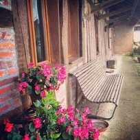 Dans ce petit gîte de pêche rustique, une cuisine, un séjour, deux chambres, une terrasse arrière avec vue sur l'étang et les volailles qui s'ébattent à loisir. La devanture est typique d'une fermette bressanne, faite de briques et de colombages.