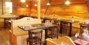 On s’y croit dans un chalet savoyard : décor tout en bois, skis à l’ancienne en vitrine, grandes scies de bûcheron aux murs, et petits coins de verdure au bord des fenêtres, c’est la montagne à Paris.