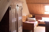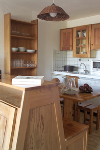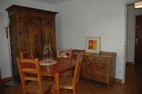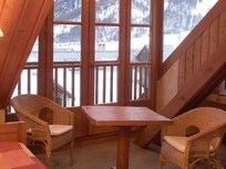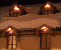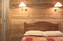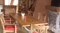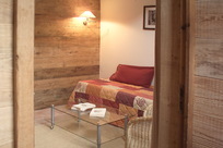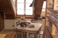 Il fait froid dehors mais cette maison là dégage une forte impression de chaleur avec son éclairage angélique qui brille sous l’épais manteaux cotonneux. Son intérieur se compose essentielllement de bois de mélèze, sapin star de la région, que viennent sublimer des tons miels, des lumières tamisées, des boutis fleuris, et une bonne odeur de popote qui s’échappe de la salle à manger.