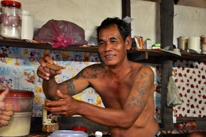Après le dîner, nous sommes conviés à nous joindre quelques instants à la veillée. Nous sommes priés de faire un don symbolique à la famille du défunt. Peu importe le montant. Nous acquittons notre présence. Tout le monde est réuni, par petits groupes, dans le long couloir qui sert de pièce de vie commune. Le Chef propose de nous initier à l’art de la sarbacane. La taille de l’arme est proportionnelle à l’habitat des Ibans mais la fléchette, elle, est ridiculement petite et légère. Paul, notre compagnon, relève le défi. Les railleries vont bon train. On ne croit pas une seconde qu’il parviendra à souffler suffisamment fort pour que la fléchette ne s’échoue pas à plus de quelques centimètres de la sarbacane. Ridicule assuré ! Mais contre toute attente, le premier essai est un succès ! La fléchette va fermement se planter dans un sac de riz ! Nos hôtes sont impressionnés.