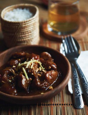 • Dans un wok, faites chauffer l’huile puis saisissez le porc de tous côtés avec la marinade. Ajoutez le lait de coco et la sauce soja puis portez à ébullition. Incorporez le tamarin et le gingembre. Laissez cuire encore 20 minutes à feu doux jusqu’à ce que le liquide soit totalement absorbé.